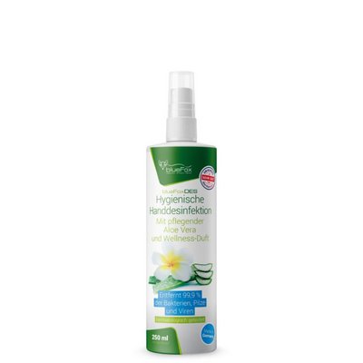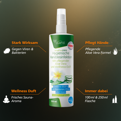 Ob im beruflichen Umfeld oder privat, die Handdesinfektion ist das A und O, wenn es darum geht, die Übertragung von Viren, Bakterien und Co. zu vermeiden und sich selbst sowie andere zu schützen. Mit einem Handdesinfektionsspray sind Sie zu Hause, auf der Arbeit und unterwegs bestens ausgestattet. Das handliche Desinfektionsmittel 250ml von blueFoxDES aus unserem Online-Shop kommt neben seiner desinfizierenden Wirkung mit einem angenehmen Duft sowie pflegender Aloe Vera daher, was Ihre Hände vor dem Austrocknen bewahrt.