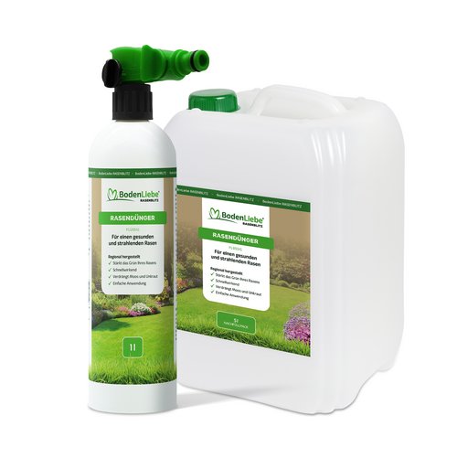 Damit Dein Rasen mit BodenLiebe wieder in sattem Grün erstrahlt, ist die richtige Dosierung unseres Flüssigdüngers RASENBLITZ entscheidend.